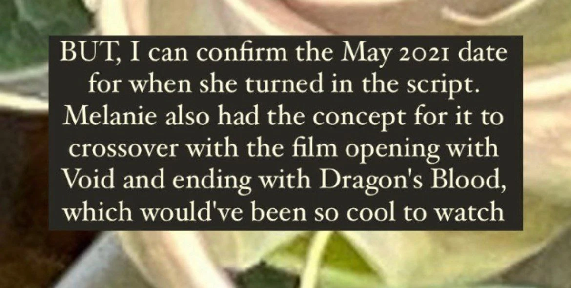 PERO, puedo confirmar la fecha de mayo de 2021 en la que entregó el guión. Melanie también tuvo el concepto de que se cruzara con la película que comienza con Void y termina con Dragon's Blood, lo cual hubiera sido genial de ver.